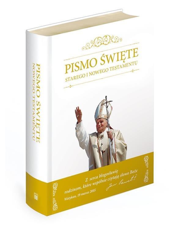 Ekskluzywne wydanie Starego i Nowego Testamentu w tłumaczeniu bpa Kazimierza Romaniuka. Elegancka biała obwoluta z wizerunkiem Św. Jana Pawła II.<br/>Biblia domowa to ekskluzywne wydanie Starego i Nowego Testamentu. Zawiera 121 wspaniałych, całostronicowych ilustracji Gustave a Dor, nawiązujących do niezwykle cenionych XIX -wiecznych wydań. Specjalne strony przeznaczone na zapisywanie ważnych wydarzeń rodzinnych sprawiają, że to wydanie Biblii może stać się wielopokoleniową kroniką rodzinną.<br/>Prezentowane wydanie zostało przetłumaczone przez biskupa Kazimierza Romaniuka jednego z najwybitniejszych polskich biblistów. Jest to pierwszy od 400 lat (od czasów ks. Jakuba Wujka) przekład Biblii na język polski, dokonany przez jednego tłumacza.<br/>W Biblii znajduje się osobiste błogosławieństwo św. Jana Pawła II dla rodzin, które wspólnie czytają słowo Boże oraz list Gratissimam sane - słowa Papieża do polskich rodzin.<br/>Atrakcyjna szata graficzna, ze stylizowanymi XIX-wiecznymi złotymi, filigranowymi ornamentami, bogato zdobiona twarda oprawa, ozdobny grzbiet i złota wstążka podkreślają niezwykłą dbałość o estetykę pamiątkowego wydania Pisma Świętego.<br/>
