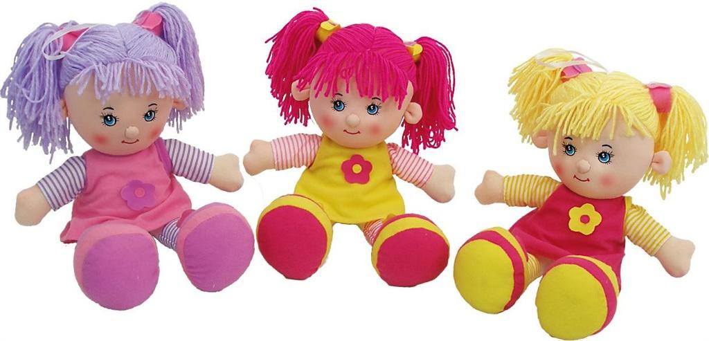 Lalka szmacianka, wysokość 35cm. Lalka przeznaczona dla wszystkich grup wiekowych z uwagi na swoją funkcję, rozmiar i charakterystykę (prosty wzór, miękka, do przytulania, łatwa do trzymania). Występują 3 rodzaje, towar wysyłany losowo.