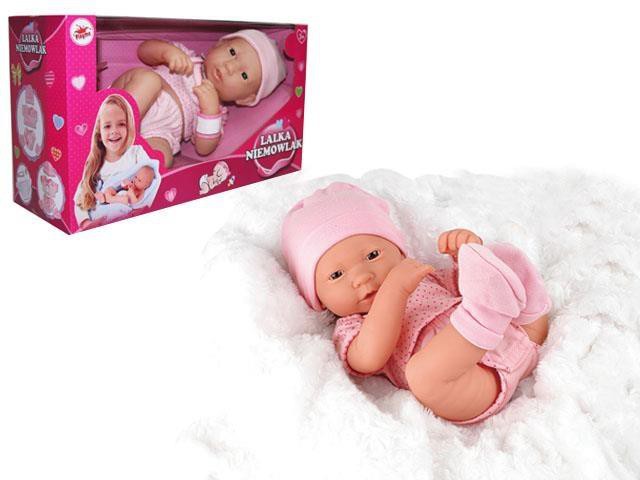 Lalka noworodek (38 cm) ubrana w kolorowe ubranko i czapeczkę, z etykietą, na której można wpisać imię bobasa z pewnością zapewni wielogodzinne emocje podczas zabawy w rodzinę. Do zestawu dołączony jest również smoczek.