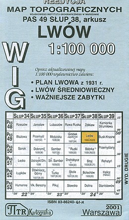 Reedycja map topograficznych Wojskowego Instytutu Geograficznego w Warszawie. Seria: Kresy. Pas 49, słup 38, arkusz Lwów. Wydanie drugie. Warszawa 2001 r.